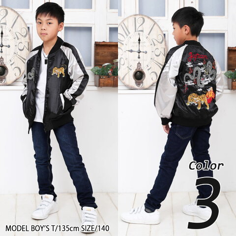 ■キッズ/ジュニア/男の子/女の子 ・豪華刺繍の入ったスカジャン!ALLシーズン使える裏地付きの薄手ライトアウター! ・当店オリジナルの豪華スカジャン!シルエットにこだわったサイズ寸法もポイントです! ・ダンス衣装やプレゼントにも最適! ■サイズ:110cm/120cm/130cm/140cm/150cm/160cm [110]着丈:約41.5cm/身幅:約36cm/裄丈:約51cm [120]着丈:約45cm/身幅:約38cm/裄丈:約56cm [130]着丈:約48.5cm/身幅:約40cm/裄丈:約61cm [140]着丈:約52cm/身幅:約42cm/裄丈:約66cm [150]着丈:約55.5cm/身幅:約44cm/裄丈:約71cm [160]着丈:約59cm/身幅:約46cm/裄丈:約76cm ■素材:ポリエステル100% ■カラー:ブラック×シルバー/グリーン×ゴールド/レッド×シルバー (本体カラー×袖カラー) ※お使いのモニターによって若干異なって見える場合がございますのでご了承ください。