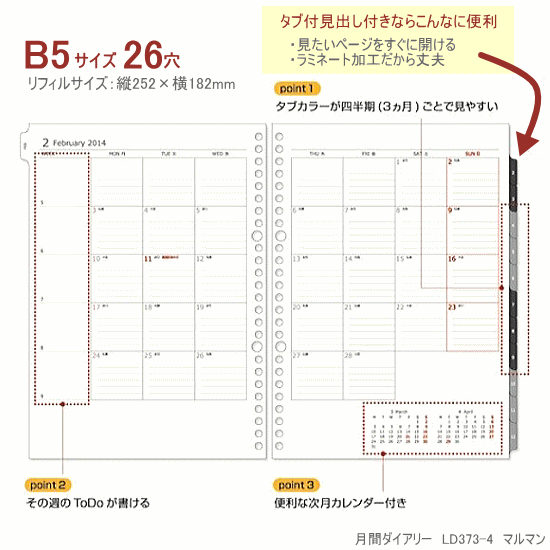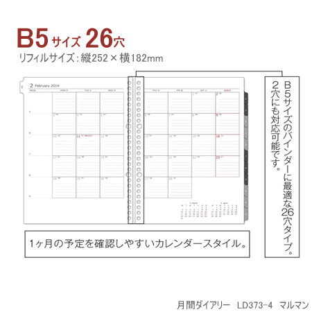 商品名 2020年 月間ダイアリー(見開き1カ月) タブ付き B5サイズ26穴 品番 LD383-20(旧品番 LD373-19) サイズ 縦257×横182mm B5サイズ 26穴 仕様 13ヶ月ダイアリー 2020年1月〜2021年1月 月間:見開き1カ月ブロック ・その週のToDoが書ける。