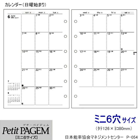 商品名 Petit PAGEM 月間&週間ダイアリー1 ポケットサイズ システム手帳 リフィル プチ・ペイジェム 品番 P-054 サイズ 横80×縦126mm (ポケットサイズ ミニ6穴サイズ) 入数 2019年12月1日〜2020年12月31日 仕様 見開き1ヶ月カレンダータイプ(日曜始まり) 見開き2週間(横罫タイプ) オリジナルホワイト用紙 メーカー 株式会社 日本能率協会マネジメントセンター ※ポケットサイズ(ミニ6穴)のリフィルですサイズ違いには十分ご注意ください。